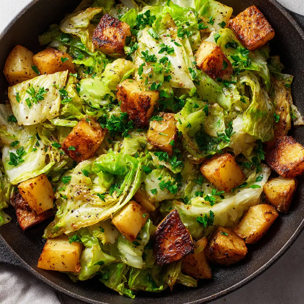 This rustic Fried Cabbage and Potatoes recipe features perfectly golden-brown diced potatoes and glossy sauteed cabbage with charred edges, seasoned with coarse black pepper and fresh parsley.