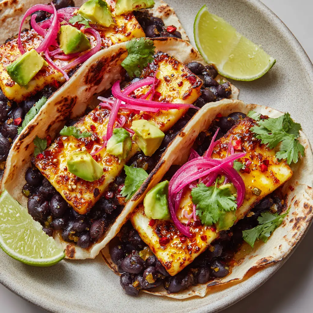 Forget everything you thought you knew about vegetarian tacos. These Halloumi Tacos are a game-changer, delivering a powerhouse of texture and flavor that will make them the new star of your taco nights. Imagine a warm, soft flour tortilla layered with a zesty black bean salad, topped with a thick slice of pan-seared halloumi cheese boasting a perfect, deep golden-brown crust. Now, picture that salty, squeaky cheese draped in a glossy, golden spicy honey drizzle, speckled with red chili flakes, and finished with the bright crunch of pickled red onion ribbons, creamy avocado, and fresh cilantro. It’s a handheld masterpiece, captured perfectly in what looks like a simple, unedited photo, but tastes like a dish from a five-star kitchen.